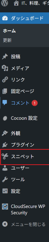 functions.phpはいじってエラーになると大変なので、スニペットというプラグインを使って追記する。